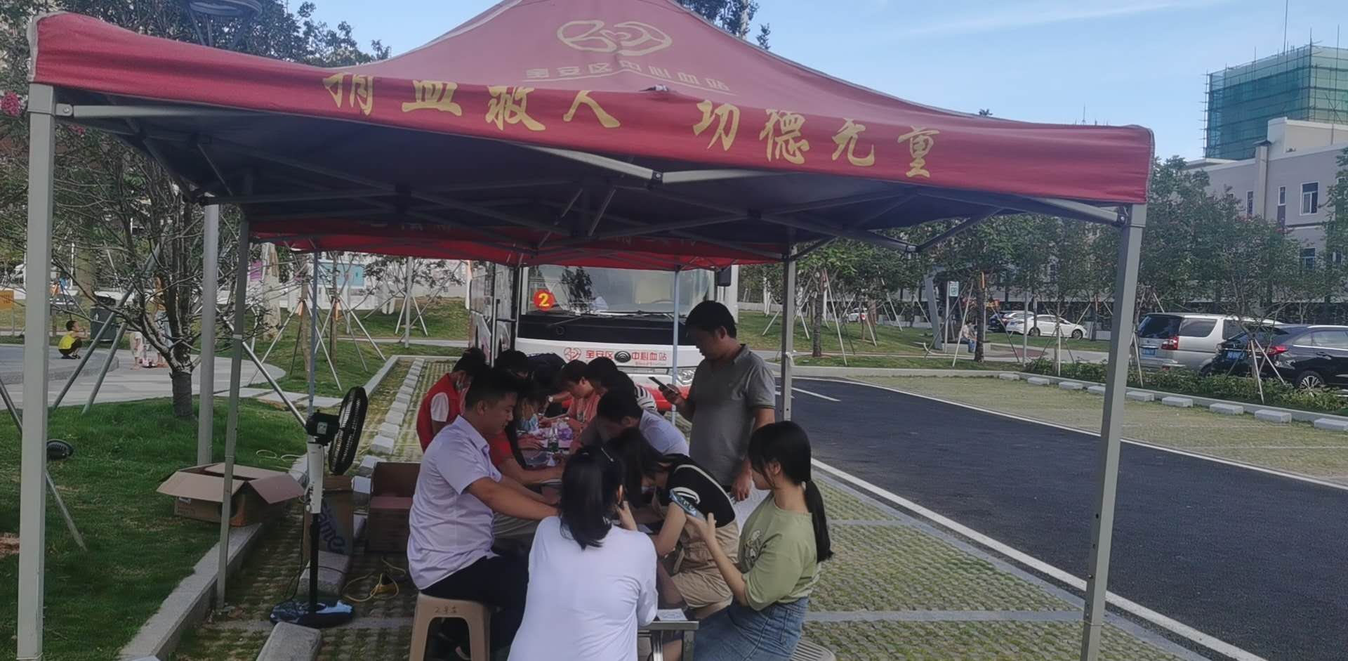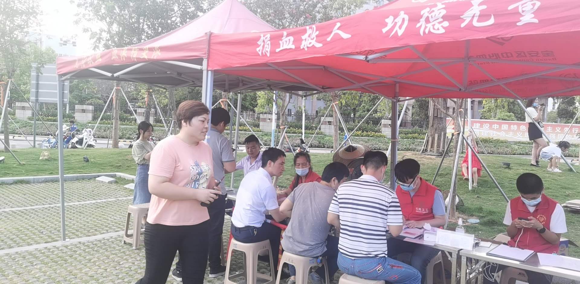 烈日炎炎,大家献血的热情依然高涨,来到松岗文化广场后,在工作人员的引导下,大家依次填表、体检、验血、抽血,他们中有的人是第一次献血,有的人则已经连续几年多次献血了献血者纷纷表示,无偿献血既是一项利国、利民、利己的善举,也是每个健康公民应尽的义务,通过无偿捐献自己的血液可以帮助那些急需救治的病人,为社会奉献一点爱心,同时还有益于身体健康。